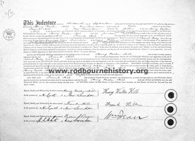 Indenture of Apprenticeship for Henry Walter Hill ID Number – 498 Image No – img010 Subject – Indenture of Apprenticeship for Henry Walter Hill Date – 1877 Donor – MallerMrG Street – Rodbourne Road Factory – GWR Carriage & Wagon Works